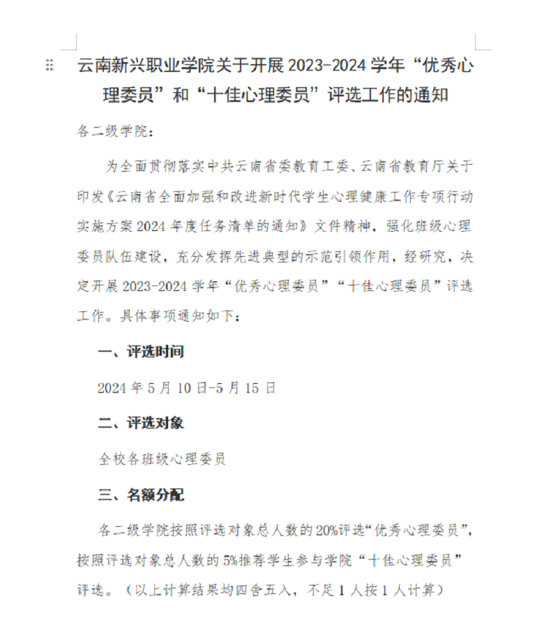 今年会jinnianhui金字招牌关于开展2023-2024学年“优秀心理委员”和“十佳心理委员”评选工作的通知各二级学院:为全面贯彻落实中共云南省委教育工委、云南省教育厅关于印发《云南省全面加强和改进新时代学生心理健康工作专项...