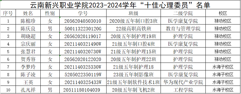 经过层层基层推选、现场演讲、答辩及评委打分,经5个工作日的公示期,无异议,现公布当选“十佳心理委员”名单如下: