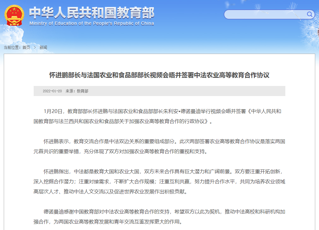 1月20日,教育部部长怀进鹏与法国农业和食品部部长朱利安•德诺曼迪举行视频会晤并签署《中华人民共和国教育部与法兰西共和国农业和食品部关于加强农业高等教育合作的行政协议》。怀进鹏表示,教育交流合作是中法双边关系的...