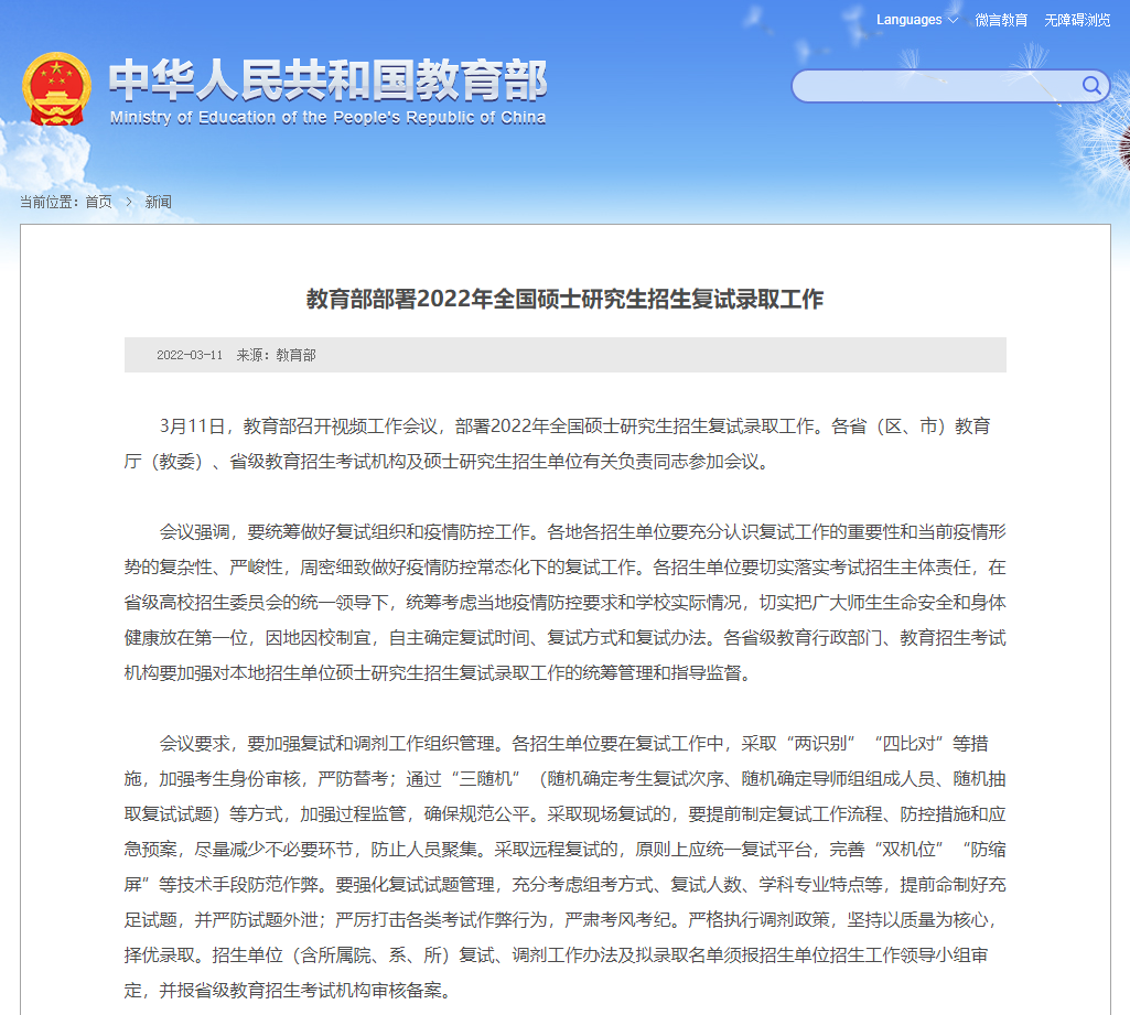 教育部部署2022年全国硕士研究生招生复试录取工作