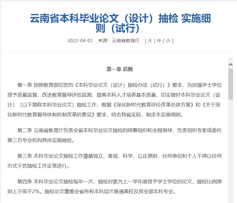 云南省本科毕业论文(设计)抽检实施细则(试行)