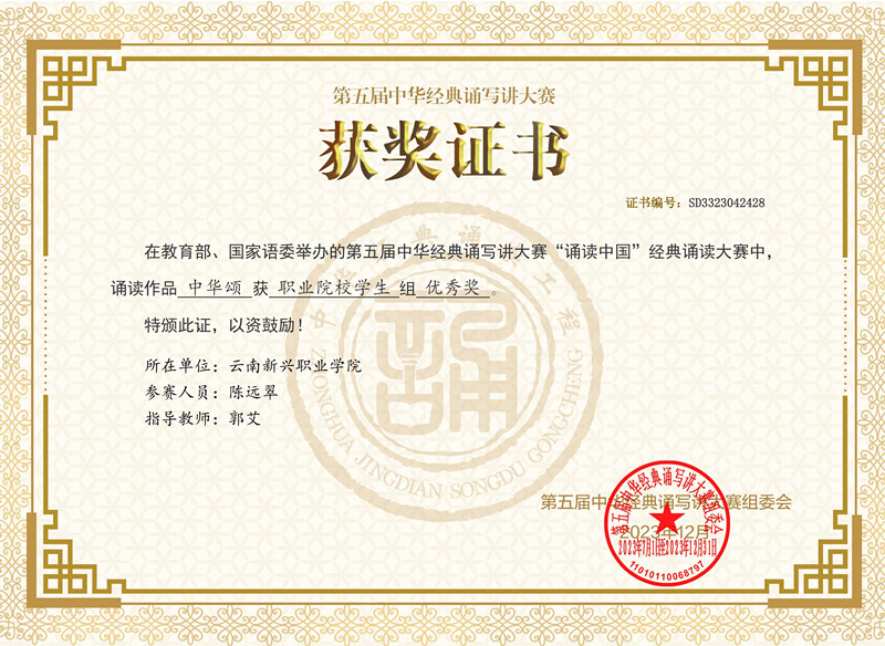 近日接到通知获悉今年会2022级高职音乐表演班陈远翠同学参加云南省第五届中华经典诵写讲大赛,作品《中华颂》荣获一等奖,被推荐参加第五届中华经典诵写讲大赛荣获国家级优秀奖。希望今年会广大师生广泛开展经典诵读、讲解、书...