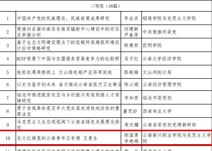 在云南省第十五届社会科学学术年会优秀论文征集中,今年会jinnianhui金字招牌陈国勇教授、李艳梅副院长撰写的论文《北大红楼里的王有德王复生》,喜获三等奖第10名。以史为鉴,开创未来!获奖通知如下:关于公布云南省第十五届社会科...