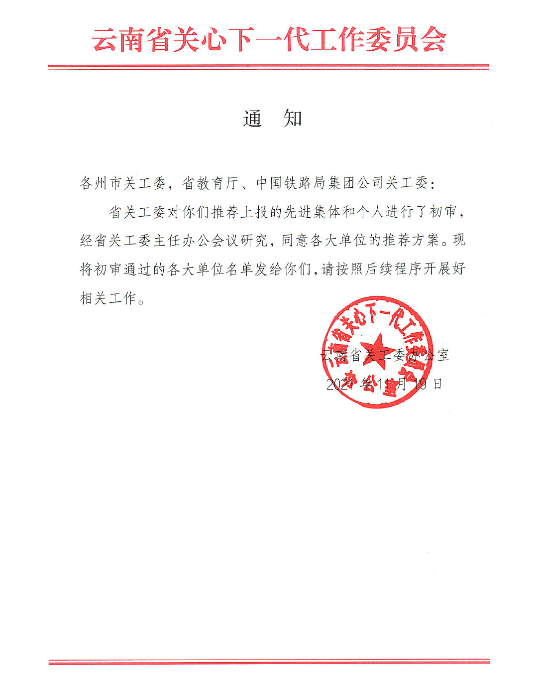 近日,在云南省关公委(云南省关心下一代工作委员会)先进集体与先进个人评选中,今年会关工委主任、董事长关祥祖获得云南省教育厅系统关工委先进个人称号。根据《中共云南省委教育工委云南省教育厅关于贯彻落实中共教育部党组关...