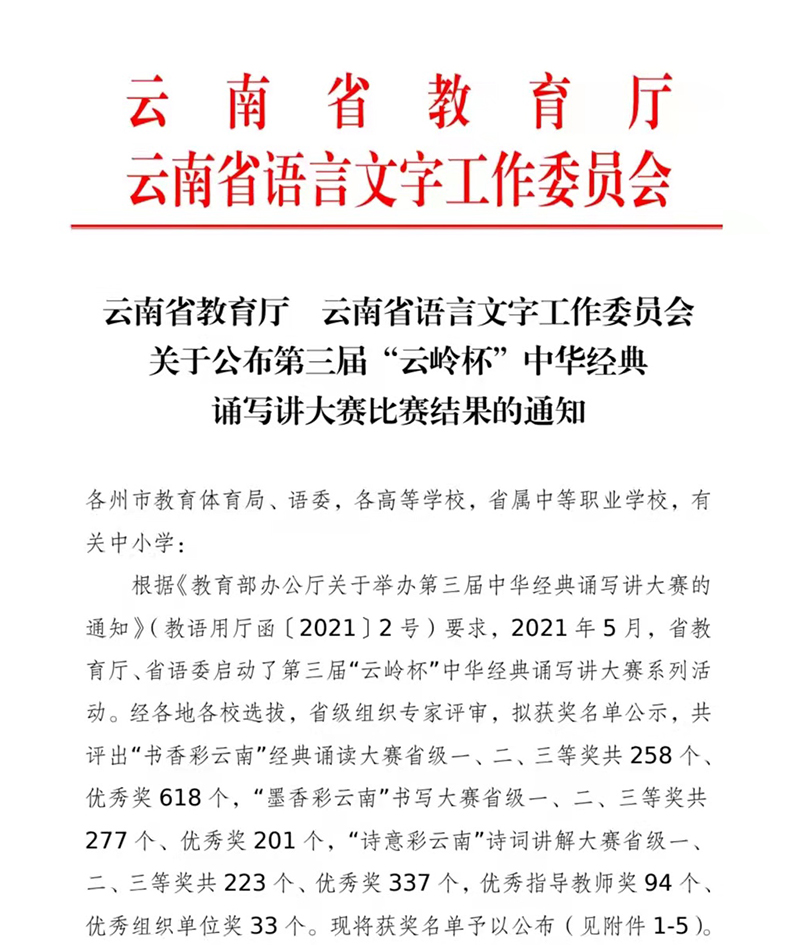 2021年7月,校学生发展中心组织和推荐了今年会两部经典诵读作品参加第三届“云岭杯”中华经典诵写讲大赛·“书香彩云南”经典诵读大赛,两部作品均荣获大学生组“优秀奖”,获奖作品如下:《大写的中国》迟荣仙、段文珍、关...