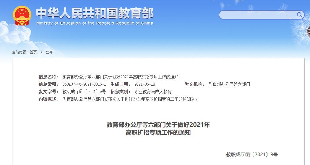 教育部办公厅等六部门关于做好2021年高职扩招专项...