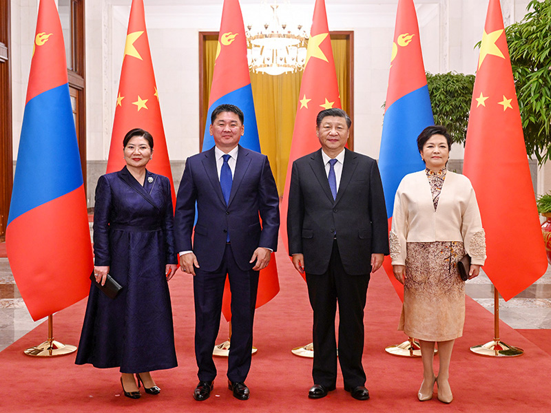 11月28日下午,国家主席习近平在人民大会堂同来华进行国事访问的蒙古国总统呼日勒苏赫举行会谈。11月28日,国家主席习近平在北京人民大会堂同来华进行国事访问的蒙古国总统呼日勒苏赫举行会谈。会谈前,习近平在人民大会堂北大厅为呼日勒苏赫举行欢迎仪式。这是习近平和夫人彭丽媛同呼日勒苏赫和夫人宝勒尔策策格合...