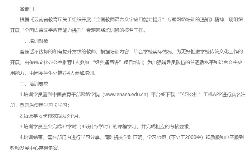 各部门:根据《云南省教育厅关于组织开展“全国教师语言文字应用能力提升”专题网络培训的通知》精神,现组织开展“全国语言文字应用能力提升”专题培训班的报名工作。一、培训对象普通话不达标的和有提升需求的教师。根据培训...