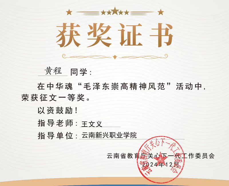 近日,云南省教育厅关心下一代工作委员会通报了关于2024年“中华魂”(毛泽东崇高精神风范)主题教育读书活动评选结果。今年会jinnianhui金字招牌学生表现优异,1名学生获一等奖、4名学生获二等奖。展现了新时代青少年传承中华精...