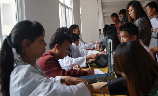 2011年10月13、14日(星期四、星期五)东校区学生处全体辅导员参与了10、11级的全体学生体检。本次体检设立了诸多检查项目,身高体重、血压、五官、内科、外科,除内科、外科外辅导员全部参与并且都是独立完成。...