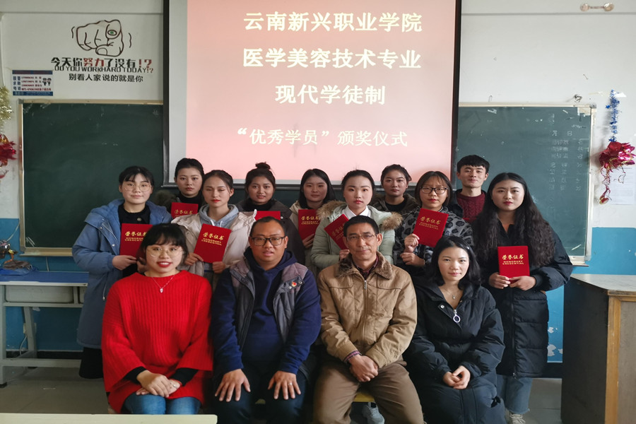 2019年12月27日,医学美容技术专业师生在一教210教室举行了现代学徒制优秀学员颁奖仪式,学院招生办李晓艳主任、医学康复学院杨炳金院长、杨思磊副院长出席本次了表彰大会,见证了医学美容技术专业职教师生的进步。