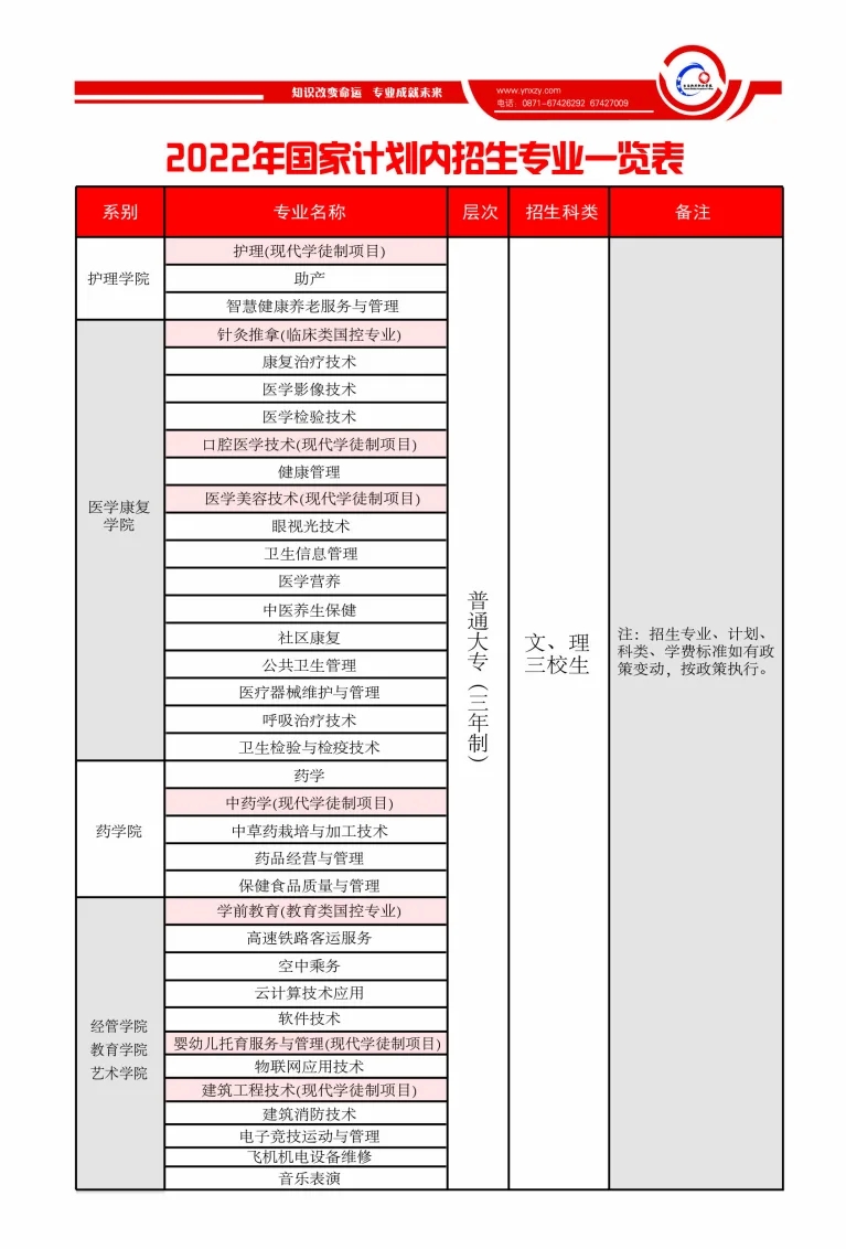 高职大专2022年云南省分专业招生计划