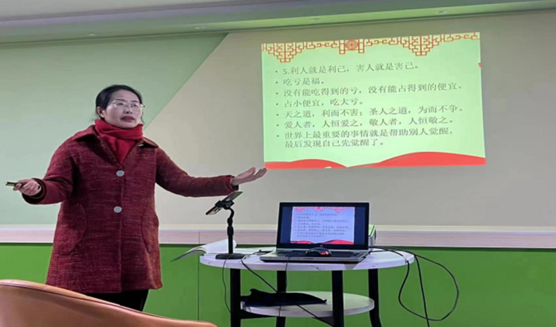 她还指出,经典是古圣先贤留给我们的智慧结晶,是中华优秀传统文化中浓缩的精华。反复诵读经典,自然成诵,老祖宗的智慧就会随时为我所用,就和我融为一体,就可以让孔孟等圣贤随时做我们的人生导师。还强调读经典贵在坚持,能引导学生树立修身、齐家、治国、平天下的理想抱负。任课教师要坚持在课前带读指定经典,帮助学生养成诵读经典的好习惯。除此之外,对本门课程中的爱国主义、自强不息,厚德载物、道德的精髓就是善、道德的根本就是孝、利人就是利己,害人就是害己等19项重要思想和理念以及教学重难点进行了详细讲解。
