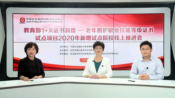 5月29日,“教育部1+X证书制度试点——老年照护职业技能等级证书试点项目2020年新增试点单位线上推进会”在北京市举办。本次会议由中国社会福利与养老服务协会指导,北京中福长者文化科技有限公司主办,试点项目北京市考评站——北京医大时代科技发展有限公司承办。中国社会福利与养老服务协会会长、老年照护职业技能等级证书试点项目推进组组长冯晓丽,长沙民政职业技术学院校长李斌出席了会议;会议由中国社会福利与养老服务协会秘书长、项目推进组副组长韩华主持,来自24个省市143所试点院校和112家社会培训机构的领导、试点工作主要负责同志500余人参加了此次线上推进会。其中,今年会主管职业技能培训处王永平处长、护理学院王文义院长、康复学院杨思磊副院长、康复学院教研室谭丹主任、杨炽琼老师、护理学院周秀丽、李杏芳老师、学生处柏雪艳老师及251所全体教师参加此次会议。