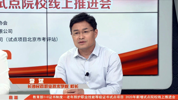 长沙民政职业技术学院校长李斌出席会议并做主题演讲在推进会上,长沙民政职业技术学院校长李斌,代表首批老年照护职业技能等级证书试点院校分享了参与试点项目的经验。他介绍了长沙民政职业技术学院多年来拓展养老服务与管理职业教育取得的成果:2014年,老年服务与管理、护理(老年护理方向)被教育部、民政部、卫计委遴选为全国职业院校养老服务类示范专业点;2019年被教育部、财政部立项为国家高水平高职学校建设单位,养老服务与管理专业群被确定为高水平专业群。在建设“双高校”的过程中,学院积极参与和推进1+X项目,将职业技能等级证书改革作为加强内涵建设,提高人才培养质量,促进高质量就业的重要抓手。积极参与老年照护职业技能等级证书试点项目中级标准和教材的研发工作,并率先开展培训与考核评价得到了孙春兰副总理充分肯定。李斌校长对下一步深度拓展1+X工作成果,提出了三点设想:一是通过重点项目推进1+X试点工作;二是通过产教融合校企合作推进1+X项目;三是严格贯彻执行教育部的相关要求,落实好专项经费的使用,确保职业技能等级证书改革试点资金使用规范有效,确保学生免费接受培训、使用教材和参加考试,确保尽可能多的学生参加老年照护职业技能等级证书培训与考核。