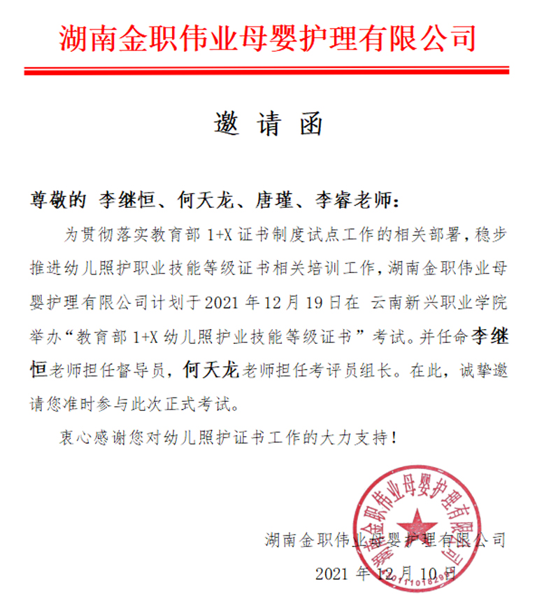 由云南省幼儿照护考评中心于2021年12月18日委派1位督导及4位考评员老师到校检查考前考场布置情况,李继恒督导巡视了幼儿照护理论、实操考场、候考间、备物间,把考场布置的情况拍照向云南省考评站进行了汇报。