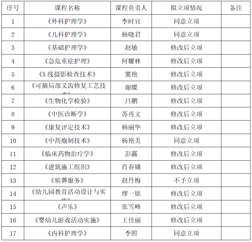 一、本年度共有17门课程符合申报条件并进入评审环节。经综合评定,拟确定《外科护理学》等16门课程为校级在线精品课程立项建设项目(详见附件《今年会jinnianhui金字招牌校级在线精品课程立项建设评审结果公示一览表》)。