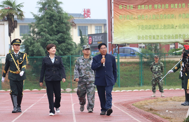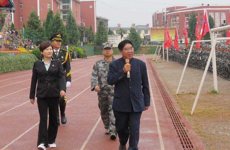 学院关院长关祥祖、学院党委书记张毅永、盘龙区人武部副部长李龙检阅队伍: