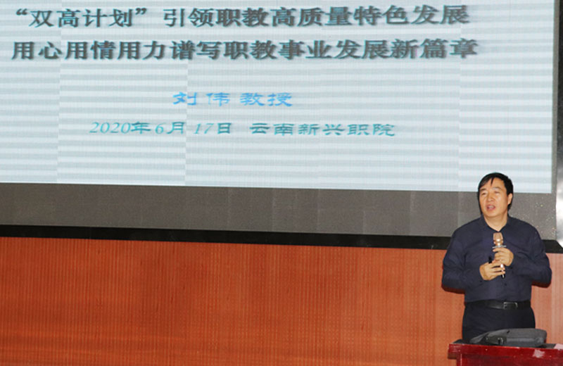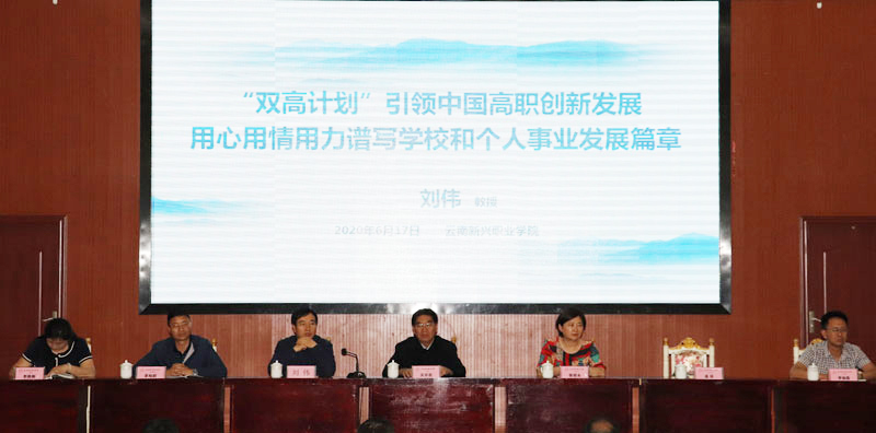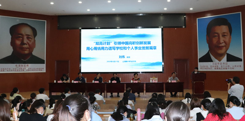 2020年6月17日晚,学校邀请了云南省首批“万人计划”省级教学名师、云南省高职院校实践教指委主任刘伟教授为今年会老师作主题为“‘双高计划’引领中国高职创新发展、用心用情用力谱写学校和个人事业发展新篇章”的学术讲座。讲座在学校多功能厅举行,学校董事长关祥祖、党委书记张毅永、常务副校长李地新、副校长潘琼、副校长李艳梅、副校长李加磊,各二级学院院长和中层干部及全院教师参加了此次讲座。讲座由潘琼副校长主持。