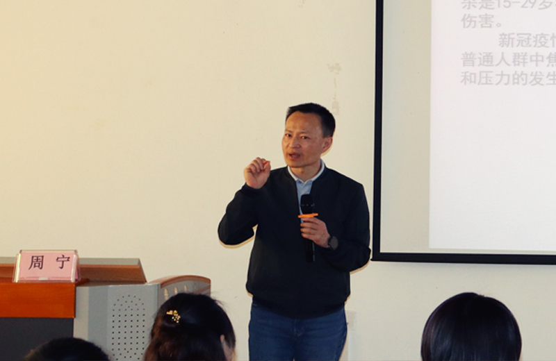 周宁教授首先分析了一组数据,全世界近10亿人存在精神障碍,让大家了解全球的心理健康状况不容乐观,人类已经从“传染病时代”进入“精神病时代”。接着他从四个方面进行了讲解:一是学生心理特点怎样判断大学生的心理健康;二是大学生常见的心理问题;三是如何干预学生出现的心理危机;四是教师心理健康的维护。