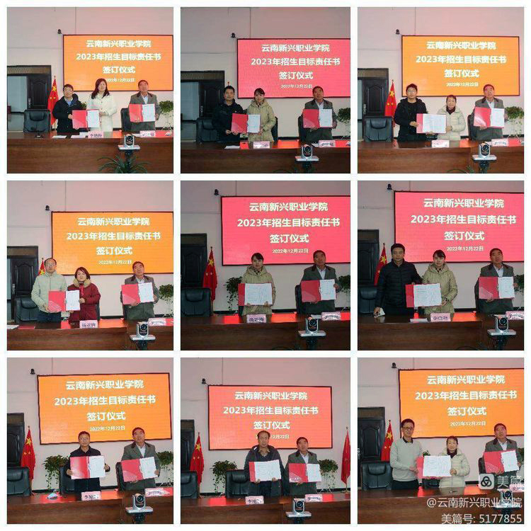 会后,关董事长分别与学校招生办、各二级学院、学工部、行政部门等签订了《今年会jinnianhui金字招牌2023年招生工作目标责任书》。