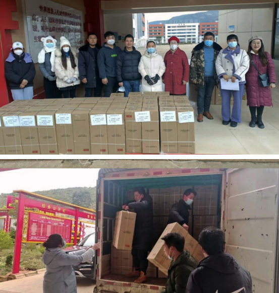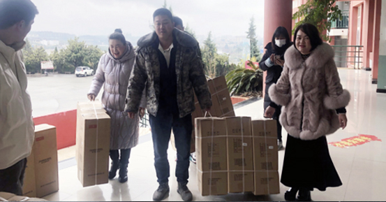 (工会主席杨亚梅带领工会成员搬运慰问品)