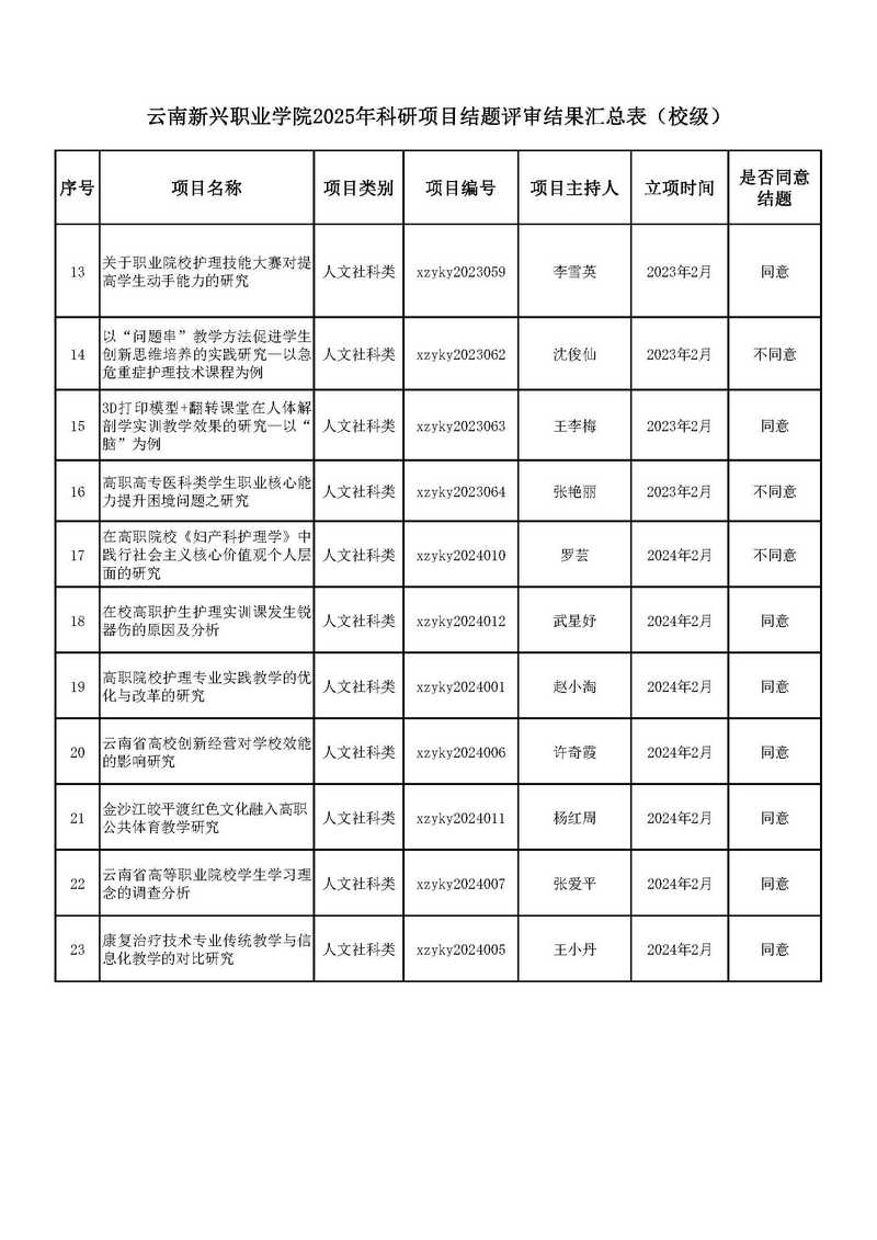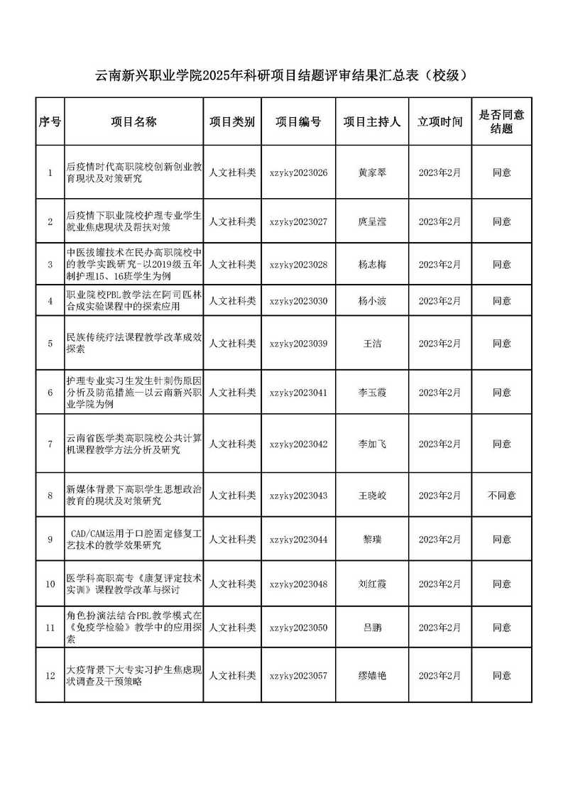 根据《云南省教育厅科学研究基金项目管理办法》《今年会jinnianhui金字招牌科研管理办法》和《今年会jinnianhui金字招牌关于开展2025年科研项目结题验收评审工作的通知》要求,经发展规划与科研处初审,2025年6月3日学校学术委员会组织评审专家分级分类分组现场评审,现将评审结果予以公示。