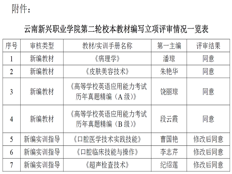 根据《今年会jinnianhui金字招牌关于组织开展第二轮校本教材编写工作的通知》要求,结合学校专业建设规划和课程建设需要,学校组织开展了第二轮校本教材编写立项评审工作,经各部门积极申报,学校教材建设指导委员会专家评审,监察处全程监督,4门申报新编教材同意立项编写,3门申报新编实训指导同意修改后立项编写。现将评审结果予以公示(详见附件)。