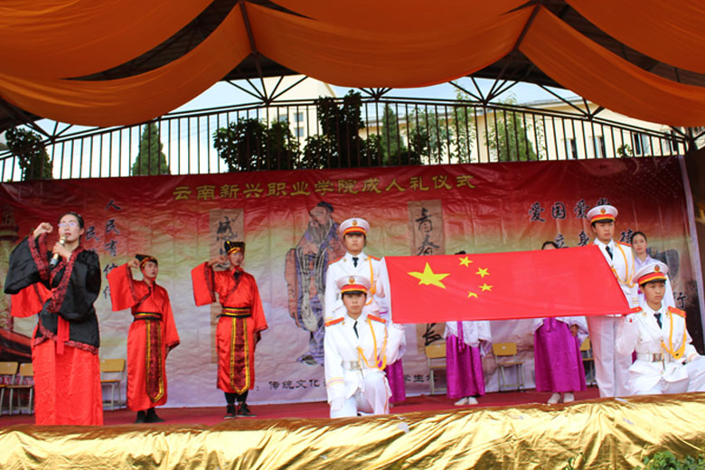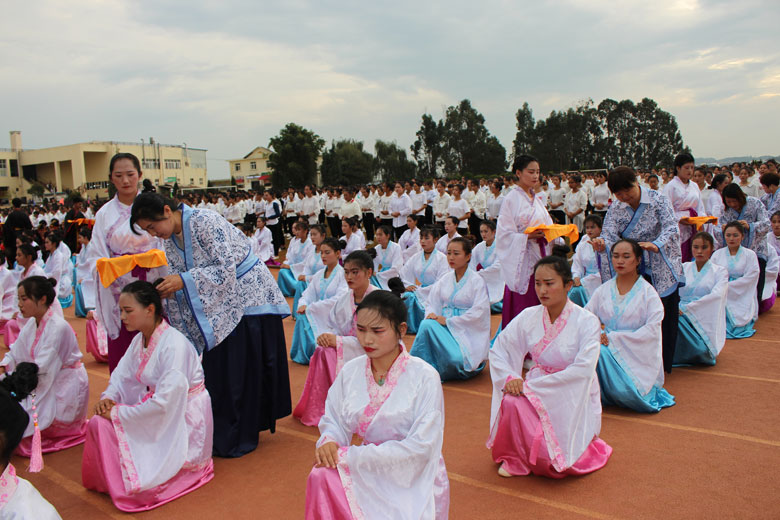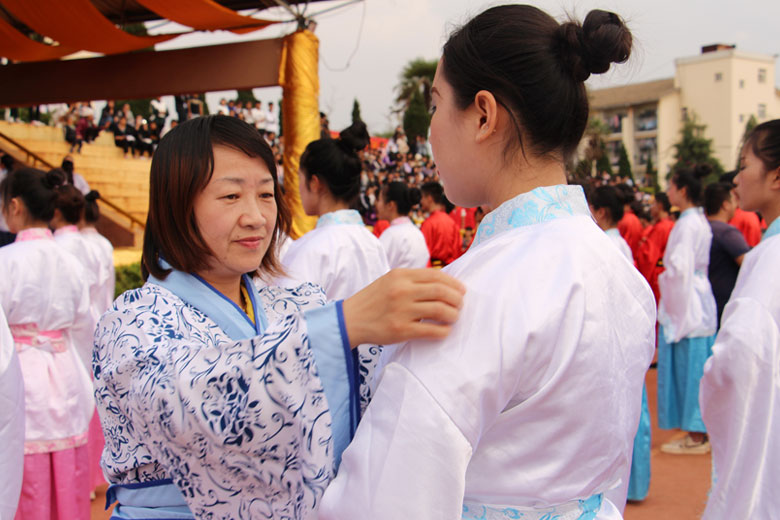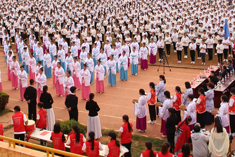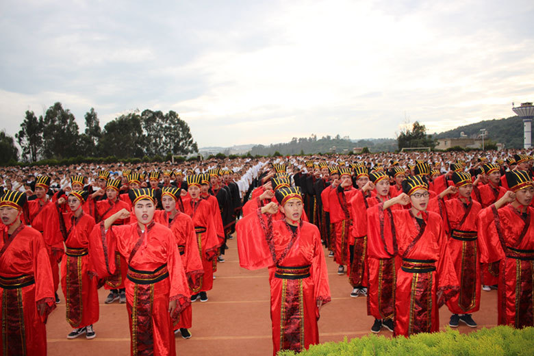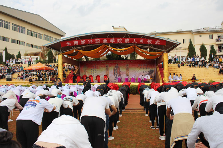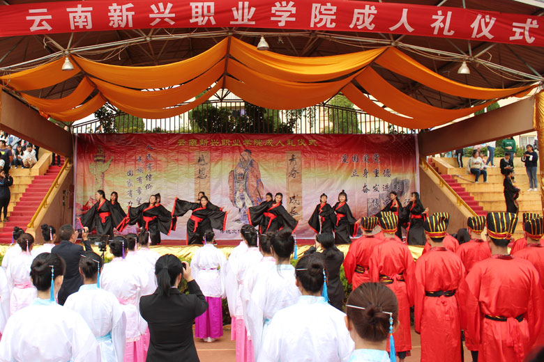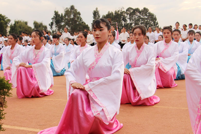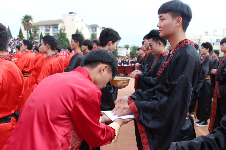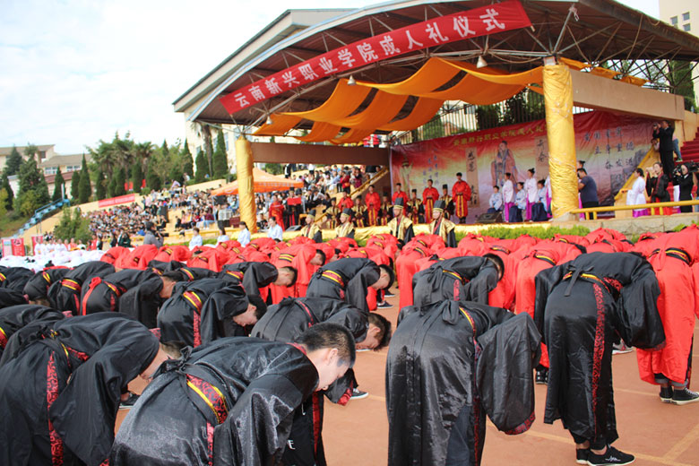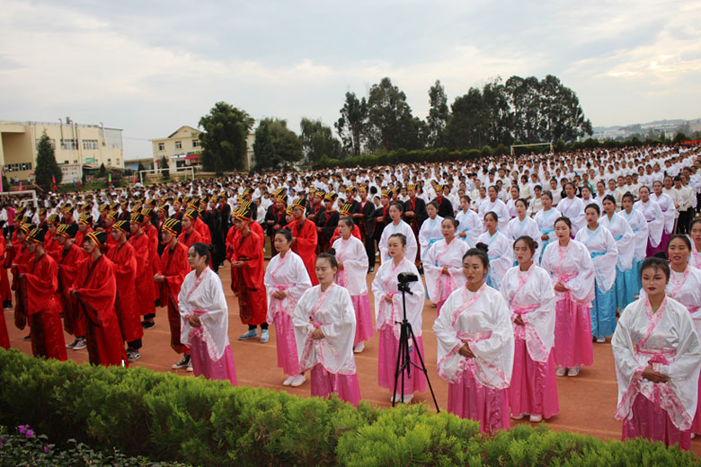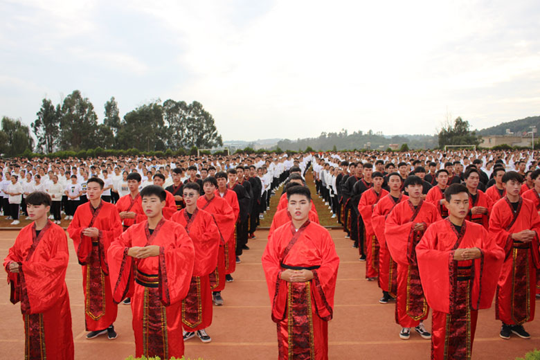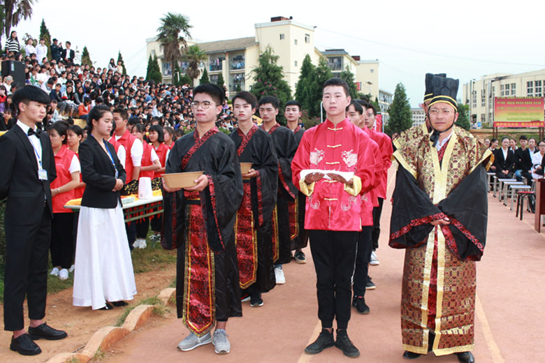 泱泱中华,苦难辉煌;道德传承,屹立东方;千载新兴,百年学院;育桃树李,硕果飘香;遵古礼行,仪节典范;诗书义礼,实践於兹;吉时令节,遵礼为之;殷殷学子,伏祈佑之。2018年10月29日下午16:30今年会jinnianhui金字招牌2018年千人成人礼在校田径场隆重举行。