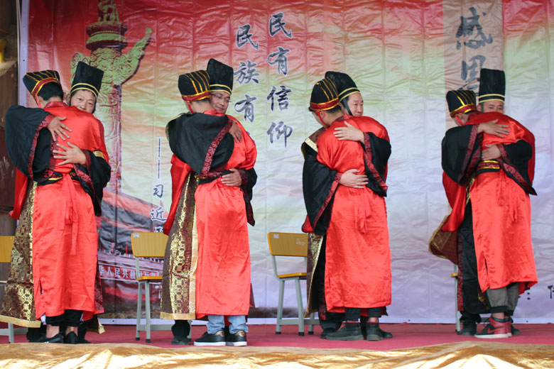 第四章:感恩亲师,修己立世。台上受礼诸生向父母行跪拜礼,感恩父母的养育之恩。台下受礼诸生向师长行鞠躬礼,感恩老师们的辛勤教诲。