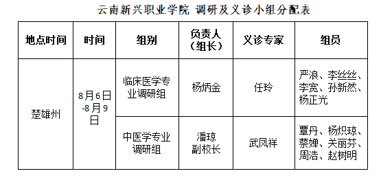 2020年8月6日-8月9日为期3天的时间,在学校潘琼副校长(副教授)的带领下,邀请了中医学专家武凤祥主任医师、云南省急救中心任玲主任医师、二级学院医学康复学院杨炳金院长、覃丹主治医师(讲师)、杨炽琼中医执业医师(助教)、关丽芬中医执业医师(助教)、蔡婵针灸推拿专业教师、李丝丝口腔医学专业教师、周浩中医学专业教师、李宽临床医学专业教师、孙新然临床医学专业教师等一行共计16位教师参加基层调研义诊活动。